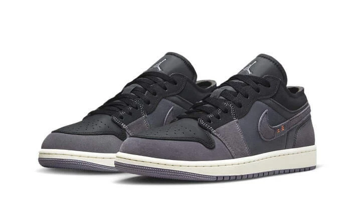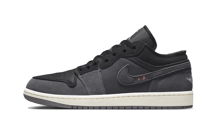 La Air Jordan 1 Low Inside Out Black arbore une empeigne mixte qui comprend cuir, textile et suède alors que des empiècements en gris foncé s’emparent du mudguard et du panel. On remarque le branding discret de la marque avec un Jordan Wings sur le talon et un Jumpman sur la languette, tous deux en argenté. À noter que la présence de surpiques oranges dans le Swoosh latéral qui signifient le numéro 23 pour rendre hommage à Michael Jordan. L’ensemble est soutenu par une semelle crème qui est complétée par une outsole grise.