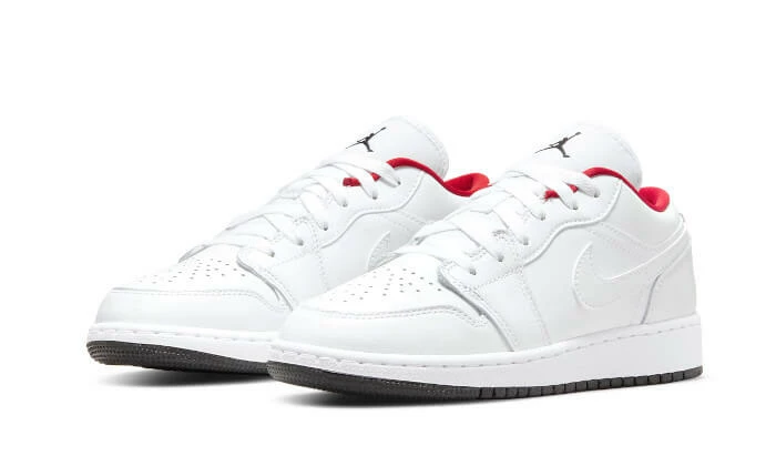 La Air Jordan 1 Low White Gym Red est constituée d’une base en cuir lisse blanc qui se voit recouverte par des superpositions en cuir ton-sur-ton. La sneaker affiche un look quasiment monochrome qui est contrasté par un col rouge et un branding en noir avec un Jumpman sur la languette et un Jordan Wings sur le talon qui s’accorde avec l’outsole qui soutient le tout.