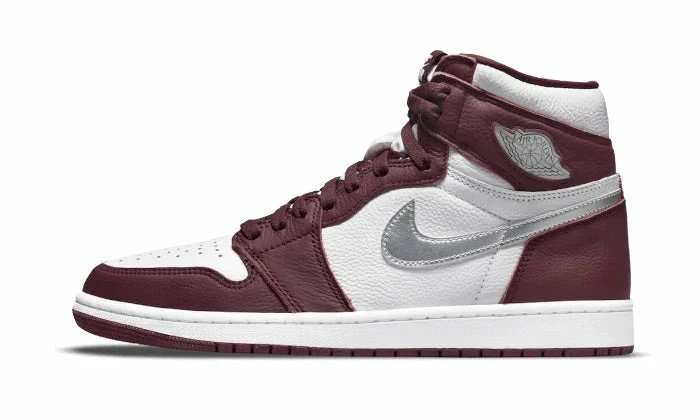 The Air Jordan 1 High OG Bordeaux features a white leather base with burgundy inserts at the mudguard, eyelets and heel. Branding includes the central Swoosh in silver, the Wings logo and Nike Air in white on the heel. The white midsole coupled with the burgundy outsole completes the look.