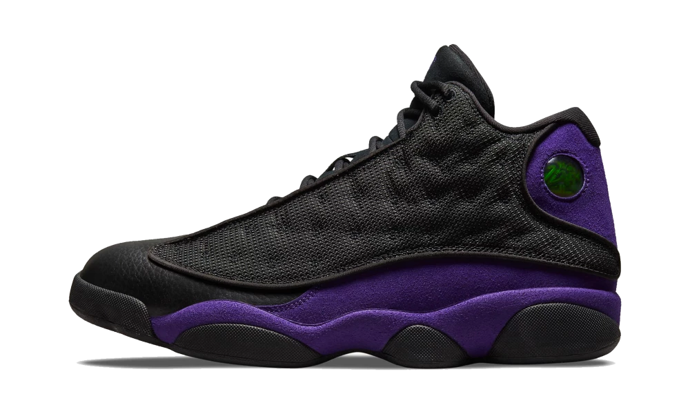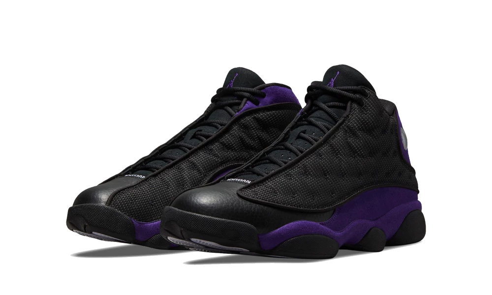 La Air Jordan 13 Retro Court Purple arbore une tige en cuir noir couplée à un empiècement matelassé réfléchissant au niveau du panel. Des détails violets apportent du contraste à la paire au niveau de la semelle intermédiaire, du talon et du col de la chaussure. Le design de la paire est finalisé par une outsole noire faisant référence à “The Black Cat” (surnom de Michael Jordan).