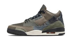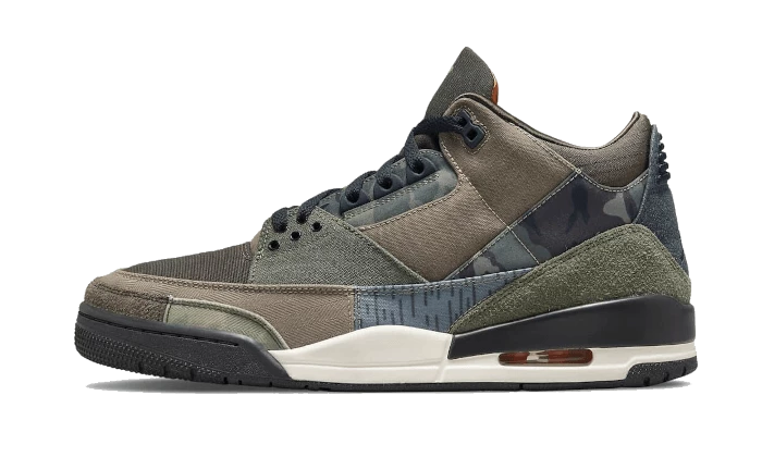 La Air Jordan 3 Retro Patchwork Camo se pare d’une empeigne mixte qui allie le daim, la toile et le nylon aux couleurs vert foncé et marron qui font référence au coloris du camouflage. Les lacets ainsi que les Jumpman sur la languette et le talon sont noirs pour assombrir davantage la paire. La midsole quant à elle est bicolore en noire et blanche.