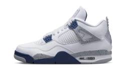 The Air Jordan 4 Midnight Navy features a white grained leather base that is elevated by tone-on-tone inserts including the TPU cage. Some navy blue detailing appears at the eyelets and sole, and grey crater effect detailing on the sole and heel. The branding on the tongue and heel completes the look.