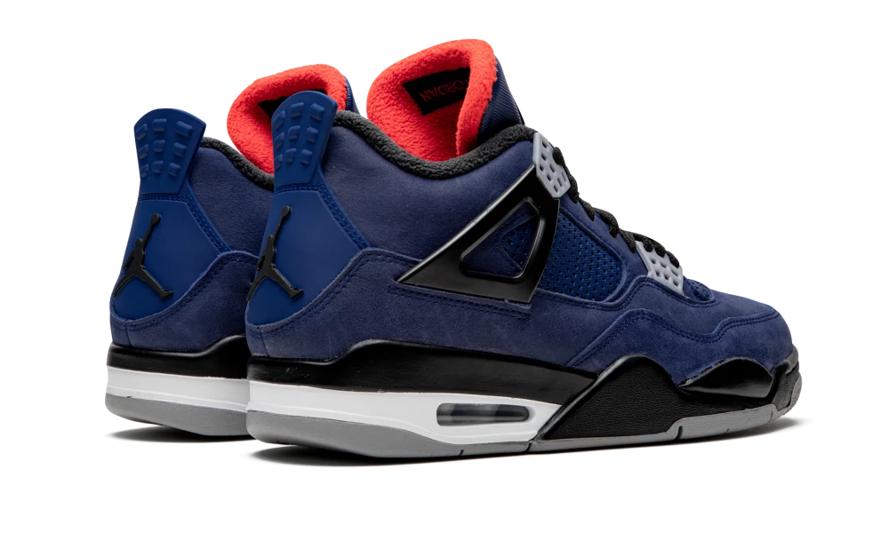 La Air Jordan 4 Retro Winter Loyal Blue est constituée d’une base en cuir et en nubuck bleu marine qui est relevée par des rappels de noir à l’image des lacets, des Wings et de la doublure. On note également un détail rouge au niveau de la languette alors que le branding comprend un Jumpman noir sur cette dernière et un second en noir également sur le talon. Le tout repose sur une midsole noire qui est associée à une outsole grise qui s’accorde avec les œillets.