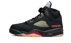 The Air Jordan 5 Retro Gore-Tex Off-Black is made of a black leather base that extends over its entirety and covers a classic TPU cage. There is red detailing found on the Gore Tex branding near the heel and on the Jumpman at the tongue. The laces support the predominance of black while the whole rests on a two-tone sole that is sublimated by a red shark tooth yoke.