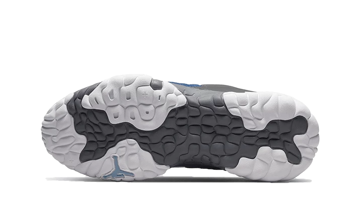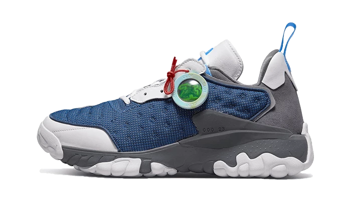 La Air Jordan Delta 2 Clot Flint déploie une structure mixte qui comprend du mesh bleu sur l’avant de la paire et le panel ainsi que du cuir blanc qui habille le mudguard, les œillets, le heel tab et la languette. On note des touches de gris au niveau du talon qui vient même s’emparer de la semelle bicolore avec du blanc.