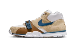 The Nike Air Trainer 1 Ale Brown features a perforated white leather base covered with brown suede inserts that add softness to the mudguard, panel and heel. There is also a blue tightening strap that covers the bottom of the laces and matches the side Swoosh. The whole thing is adorned with nice touches of white with the laces, collar and sole.