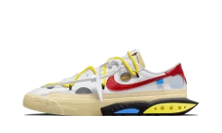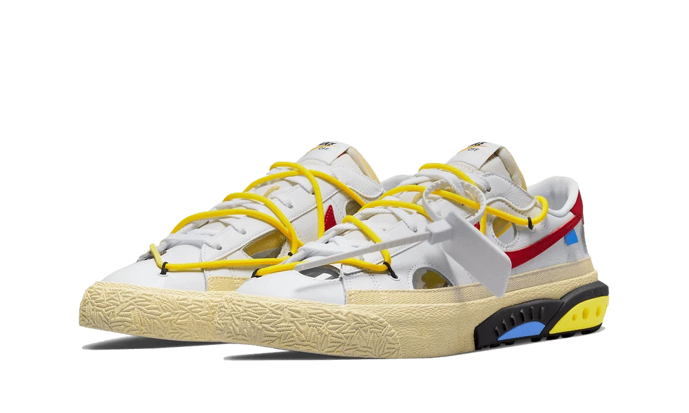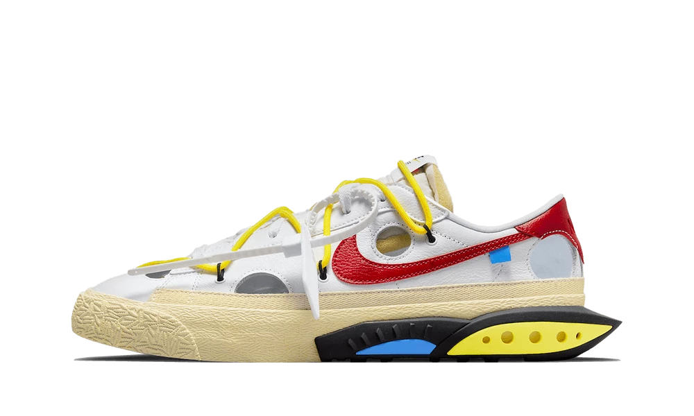 La Nike Blazer Low 77 Off-White University Red arbore une base en cuir blanc qui est agrémentée par des détails jaunes à l’image des sur lacets et de la midsole. On retrouve le Swoosh latéral rouge qui s’accorde avec le renfort arrière. L’ensemble original repose sur une semelle couleur crème enjolivée par des motifs ton-sur-ton ainsi que des revêtements en bleu et jaune.
