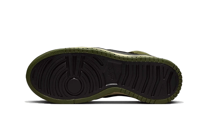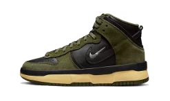 The Nike Dunk High Up Medium Olive features a black leather upper that is accented by dark green suede inserts on the mudguard, eyelets and quarter panel. A silver embroidered mini Swoosh covers the tone-on-tone side Swoosh. The whole set is supported by an imposing yellowish midsole and a dark green outsole.