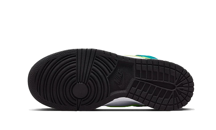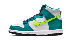 The Nike Dunk High Volt Bright Spruce features a white leather base that is accented by blue green leather overlays on the mudguard, eyelets and quarter panel. A neon yellow side Swoosh brightens up the upper, while the black laces add a dark edge that is complemented by the outsole.