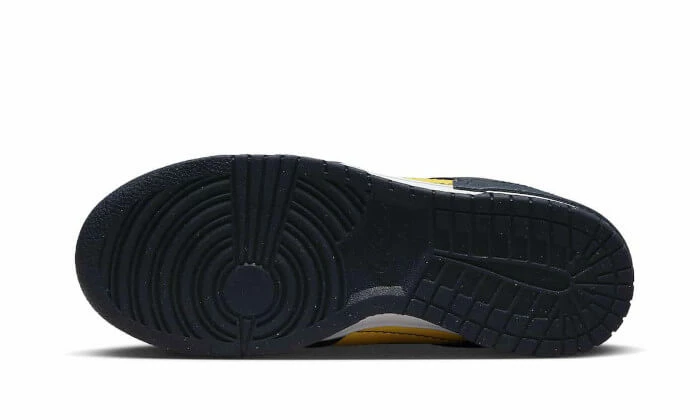 The Nike Dunk Low Disrupt 2 Michigan features a smooth yellow leather base that is enhanced by smooth navy leather inserts on the mudguard, eyelets, quarter panel and mini Swoosh near the eyelets. A second side Swoosh only appears with navy blue stitching around the edges. A white midsole contrasts with the two-tone look of the pair, which is completed with a navy blue outsole to match the colour code.